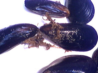 (mytilus edulis) est un mollusque bivalve, métazoaires, embranchement des mollusques. Coquilles de 10cm de long et 3,5cm de large environ, d'une couleur noir, noir-gris, noir-bleu, tapissée de nacre bleuâtre à l'intérieur, les moules vivent dans la mer, au voisinage des côtes, par groupes de nombreux individus fixés sur les rochers battus par les vagues, ou sur des sols vaseux, sur des pierres. elle est riche en calcium, en fer, en iode.