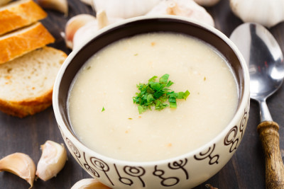- Mixer les légumes en soupe, ajouter la crème fraîche, le sel, le poivre et remuer. Déguster la soupe à l'ail bien chaude.